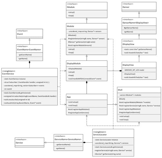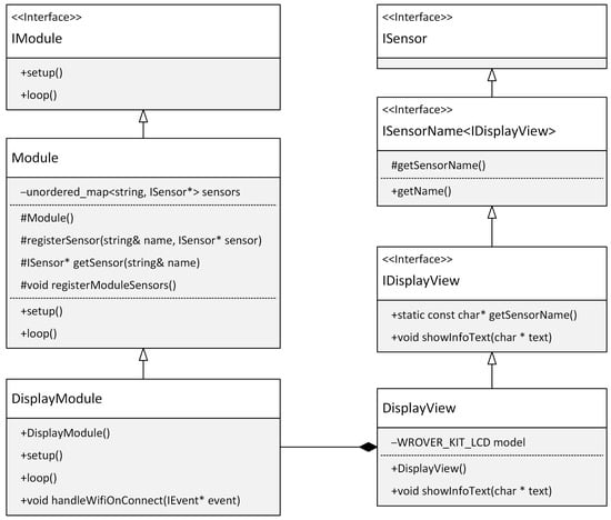 The Factory Method design pattern inspires the registration process, allowing the DisplayModule class to dynamically manage an instance of the DisplayView class. This arrangement provides flexibility and ease of replacing or updating display components. Thanks to this principle, the interaction between the display and the application logic is mediated through an abstract interface, resulting in increased modularity and flexibility of the overall system. The DisplayModule thus acts as a link between the specific display hardware and the platform-independent application logic. This interconnection aligns with the Sensor-View design pattern principles and strengthens our application’s platform independence. Furthermore, this model facilitates application integration and maintenance, as changes in the display driver do not affect other application parts. This allows developers to respond flexibly to new requirements or changes in the hardware environment. Figure 18 shows a class diagram of the sensor registration implementation within the module.