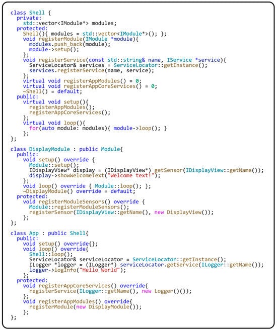 The app class is the input class for the modular application and is responsible for initializing the entire application. The App class is a child of the Shell base class. The registerAppCoreServices() method in the app class is used to register the infrastructure services of the modular application, and the registerAppModules() method is used to register the modules. Subsequently, the setup() method of the App class initializes the application’s default state. Within our sample code, the registerAppModules() method registers a specific application module, such as the DisplayModule class, and the registerAppCoreServices() method registers the Logger infrastructure service using the registerService(…) method. The Logger service is responsible for the general logging mechanism in our sample application. This structure of the App class allows us to efficiently manage and coordinate both modules and services within the entire application. Figure 20 illustrates the relationships between the classes and how each component is integrated within our framework.