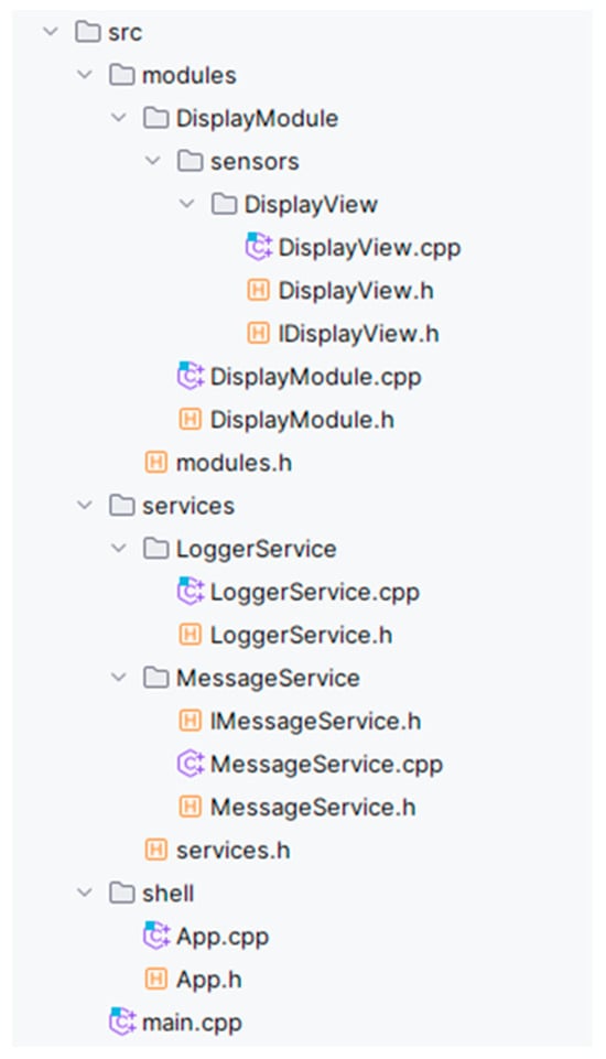 The proposed structure of the software project, shown in Figure 21, represents a well-thought-out and systematic approach to developing a modular application. Each of the key directory modules, services, and shell has a specific purpose, and together, they form a solid foundation for flexible and scalable application development. The header files in the services and modules directories provide a centralized approach to managing and integrating components, significantly increasing code efficiency and maintainability. The sensor subdirectory in the modules directory demonstrates our ability to decouple platform-dependent components from application logic, allowing us to achieve a higher level of code abstraction and reuse. This carefully designed modular structure of our project promotes efficient development and facilitates future extensions and maintenance of the application, but also contributes significantly to the robustness of the testing processes. By dividing the application into separate modules, we can implement targeted tests for each more minor part of the system. This approach allows the detailed verification of the functionality of individual components independently of other parts of the application. This leads to an increase in the quality and reliability of the entire software solution.