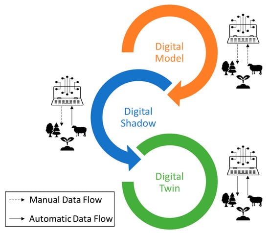 The level of integration of a DT denotes the extent to which it is linked and synchronized with its physical counterpart and the broader operational environment. This integration spectrum spans from basic to advanced levels, reflecting the sophistication and efficiency of the DT system. At its development stage, there may be a one-way transfer of data from the physical entity to the DT. As integration advances, a bidirectional exchange of information can be established, allowing the DT to actively interact with and influence the physical system in real-time. A heightened level of integration enhances the DT’s capacity to offer precise real-time insights, support predictive modeling, and support more informed decision-making processes across various domains, including agriculture and forestry.