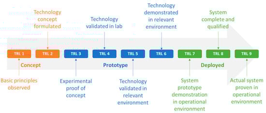 The categorization of Technology Readiness Levels (TRL) within the European Union [65] is organized into three overarching maturity levels: Concept (TRL 1–2), Prototype (TRL 3–6), and Deployed (TRL 7–9).