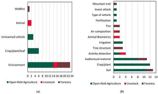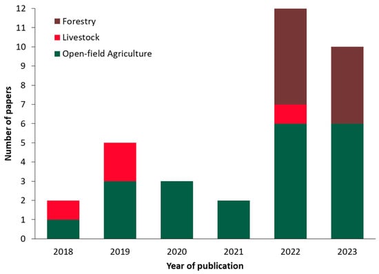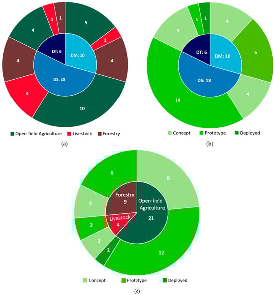 The majority of the selected studies are on open-field agriculture, followed by forestry and livestock, comprising 21, 9, and 4 papers, respectively, as can be depicted in Figure 5a. Notably, forestry-related DT applications were published solely in the last two years (2022, 2023), indicating a recent trend in this domain. This fact showcases a symbiotic relationship among the three examined sectors, as knowledge and insights gained from one domain often find fertile ground and relevance in the others. This interconnectivity emphasizes the importance of the present cross-disciplinary approach, as advancements in DT in one sector have the potential to affect the progress in the other sectors.