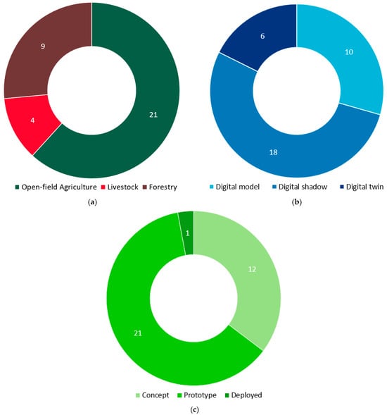 In the direction of getting an insight into the degree of technology maturity of the examined cyber-physical systems, the methodology analyzed in Section 3.3 was followed through the classification into “concept” (TRL 1–2), “prototype” (TRL 3–6), and “deployed” (TRL 7–9) according to the TRL scale of [65]. It is important to note that a technology is considered “deployed” once it has been demonstrated in an operational environment. If it has been validated or demonstrated in a relevant environment, it is still at the prototype maturity level. As can be deduced from Figure 5c, only one of the reviewed technologies was classified as deployed, which was presented in [74]. In the specific study, a ready-to-use cyber-physical system simulating real-time rice crop conditions was presented. The system employs an ontology-based knowledge base for plant growth in conjunction with real-time data from rice fields, enabling adaptive resource scheduling and optimal decision-making for rice cultivation. In contrast, 12 reviewed technologies were at a conceptual maturity level, signifying that they were still in the early stages of development. The majority of the technologies were at an intermediate maturity level (TRL3 to TRL6), totaling 21 instances. This indicates that these technologies have advanced beyond the conceptual stage and may have been demonstrated or validated in laboratories or relevant environments. The progression to this level suggests a notable transition from theoretical development to practical implementation. Nevertheless, the limited number of technologies at the highest maturity levels highlights the challenges associated with achieving full-scale deployment and widespread adoption in real-world settings. This can be attributed to the inherent complexity of designing and implementing DT in the agricultural and forestry context, where factors like diverse ecosystems, variable conditions, and operational intricacies contribute to a slower progression from concept to practical deployment.