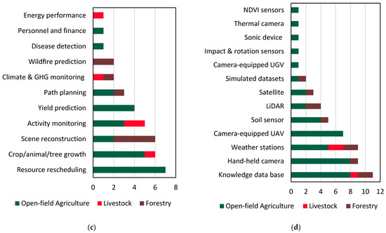 Finally, as can be deduced from Figure 7d, a variety of IoT sensors have been used in all examined application fields, while remote sensing has been utilized in many studies associated mainly with open-field agriculture, either utilizing datasets acquired by UAVs equipped with cameras or using satellite data. This result agrees with the findings of the recent review on ML in agriculture [23], which highlighted the increasing usage of UAVs versus satellites. On-site camera photography has also been employed in various studies, while Moysiadis et al. [79] used a camera-equipped UGV, highlighting their role in capturing visual data, usually to be utilized as input in Deep Learning models [102]. A thermal camera has also been utilized in one of the studies to monitor the physiological changes of bananas throughout storage [78]. LiDAR technology, with its capability for detailed terrain mapping, appears in a significant number of studies, providing a specialized tool for precise data collection.