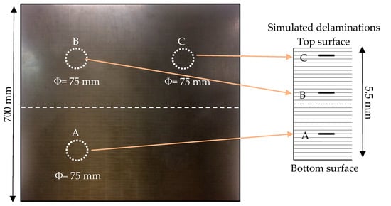- Migot, A.; Mei, H.; Giurgiutiu, V. Numerical and experimental investigation of delaminations in a unidirectional composite plate using NDT and SHM techniques. J. Intell. Mater. Syst. Struct. 2021, 32, 1781–1799. [Google Scholar] [CrossRef]
