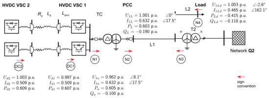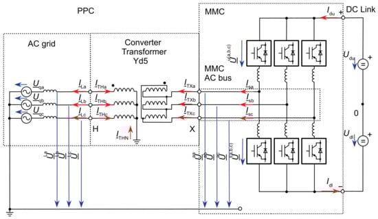 The output of the MMC is delivered through the converter transformer to the PCC to the power system. The currents and voltages at the AC bus of the converter and the PCC are defined by the active-sign convention, as shown in Figure 2.