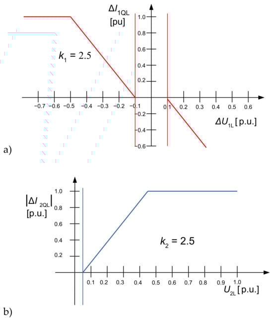 As shown later, deadbands of minimum voltage deviations to trigger the FRT functionality have a significant impact on the behaviour of transformer protection in the case of low fault currents. The ordinance for wind power plants [15] defines the term relevant voltage deviation , for positive- and negative-sequence voltage. If , deviates only within a defined deadband, the relevant voltage deviation is set to zero. The required additional reactive current in positive-sequence system shall be proportional to a predefined droop factor k1 (3), as shown in Figure 3a. In Germany, the guideline VDE-AR-N 4120 [2] requires an additional reactive negative-sequence current proportional to the negative-sequence voltage at the PCC (as shown in Figure 3b) according to (4).
