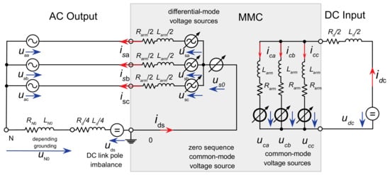 For modelling the dynamics of the MMC control, the average value model ([13,14,16,17,18]) with decoupling of the AC and DC sides of the MMC in controllable voltage sources is applied, as shown in Figure 4.