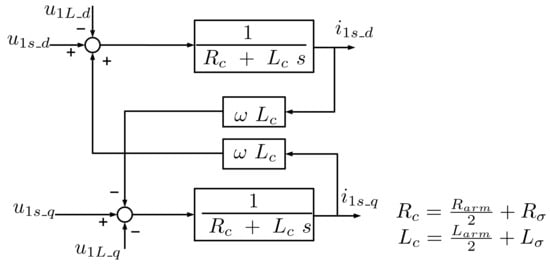Space Vector Current Control (dq current control) is a well-known current control technique for three-phase currents that uses a rotating synchronous reference frame synchronised with the grid voltage. The block diagram of the transfer function of the AC output equivalent to the differential equation of the HVDC MMC current control plant in the positive-sequence dq-synchronous reference frame is shown in Figure 5.