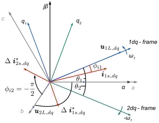 Figure 6 shows the positive- and negative-sequence space vectors of grid voltage , and converter current control reference values , i*2s_dq in the dq-synchronous reference frames. The grid voltage positive-sequence space vector is aligned with the phase-locked loop (PLL) to the d-axis and, therefore, has a zero-degree phase shift. The positive-sequence grid voltage space vector is rotated by , and the negative-sequence grid voltage by due to the converter transformer vector group compensation, which is shown in the figure accordingly. In this way, the converter current phase shift angles can be directly related to the grid voltage. Consequently, the positive-sequence instantaneous active and reactive powers are directly related to the positive-sequence dq components.