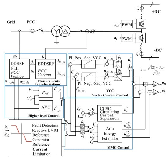 The MMC is designed with Insulated-Gate Bipolar Transistor (IGBT) devices, 400 submodules (SM) per arm, and an arm inductance of 50 mH or 0.33 p.u. A submodule capacitance of 10 mF was chosen based on the proposal of the energy storage requirement of the MMC total energy of 40 kJ/MW, as described in [21,22]. The used half-bridge MMC model was an arm-level averaged (ALA) model with blocking capability [23]. With the aggregate model, it is assumed that the capacitor voltages of all power modules are balanced by a subordinate regulation. However, the dynamics of the control system, the harmonic content of the converter, the vertical energy flow, and the horizontal energy flow with the phenomenon of circular currents are well represented. The HVDC-MMC control layout and the measured, reference, and output values for the inverter-based generation test power system are outlined in Figure 7. The control hierarchy of the MMC consists of the higher level control, the Vector Current Control (VCC), and the MMC internal control. The outer loop sets the reference values for the VCC. The high-level control consists of an AC voltage controller (AVC) and active power control for steady-state operation. To comply with the LVRT requirements, a parallel block generates the positive- and negative-sequence current reference values for the VCC in the event of a fault. The MMC internal control comprises the Circulating Current Suppression Control (CCSC) and the arm energy control. In steady state, the control is designed for the grid-following mode.