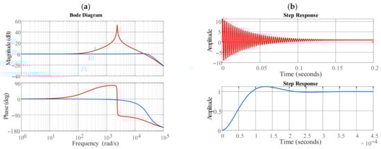 Figure 10a shows the bode plot of the closed-loop current control transfer function with a DDSRF low-pass filter of (red line) and the implemented low-pass filter of (blue line). For the first DDSRF low-pass filter, the magnitude characteristic shows a sharp rise with a simultaneous drop in the phase of 180 degrees at 2350 rad/s. In contrast, for the second DDSRF low-pass filter, this rise is in the range of the first-order time delay cut-off frequency and therefore it has negligible influence on the dynamics of the current control loop. Figure 10b presents step responses for the closed-loop current control transfer function with a DDSRF low-pass filter for two values of Tf. Very low settling time and small overshoot is observed for the second DDSRF low-pass filter (see Figure 10b, blue line)—this result proves that PI controller settings are correctly matched and the proposed low-pass filter with high cut-off frequency was properly designed.