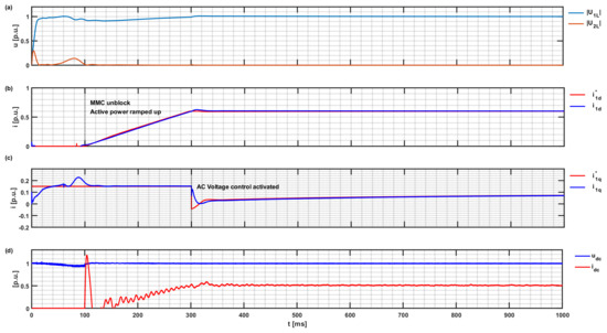 MMC-HVDC active power ramp-up to the operation point: (a) PCC voltage: |U1L|; |U2L|, set point, and actual dq components of injected active and reactive currents in DDSRF, (b) i*1d; i1d, (c) i*1q; i1q, and (d) DC-link voltage and current udc; idc.