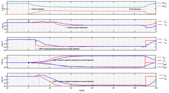 The LVRT control is implemented based on the grid code requirements for reactive positive- and negative-sequence current contributions described in the theoretical background and implementation descriptions in [13,19,27]. The LVRT control logic comprises fault detection and drop-out logic, as well as positive- and negative-sequence current reference generation and current reference limiting. The fast fault current provision time impacts protection operating time and should, according to VDE-AR-N 4120 [10], not exceed a maximum step response time of 30 milliseconds.
