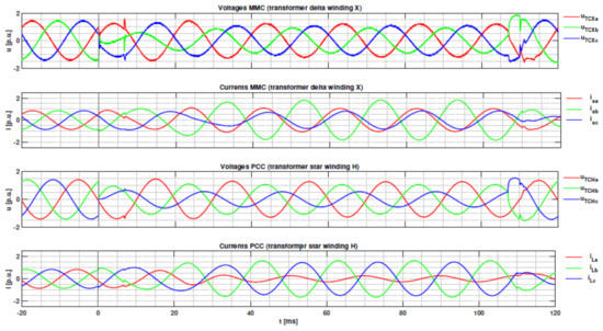 Figure 13 shows the positive- and negative-sequence voltage at the PCC, the reference and actual values of positive- and negative-sequence current in dq components of the DDSRF in the MMC LVRT, and current control. It can be seen that before the fault inception, the PCC voltage is 1 p.u., the active current component i1s_d is about 0.6 p.u., and the reactive current i1s_q of 0.06 p.u. is set by the active power control and the AVC. The positive-sequence voltage deviation at 7 ms after fault inception is 0.26 p.u. Therefore, after deadband subtraction, the relevant positive-sequence voltage deviation of 0.16 p.u. is given to the LVRT reference generator, and then the requested reactive current reference value is set to −0.35 p.u. The measured deviation of the negative-sequence voltage at 7 ms after fault inception is 0.2 p.u., and it increases to the final value of 0.34 at 20 ms due to the averaging over a quarter of the power system frequency cycle. By applying (12), the final requested reactive negative-sequence current reference value of 0.72 p.u. is obtained at 30 ms after fault inception. The negative-sequence current q-component does not correspond to the reference value until another 10 ms later, which is due to the phase shift delay of the feedforward negative-sequence voltage at the negative-sequence q-component PI controller, caused by the DDSRF low-pass filter.