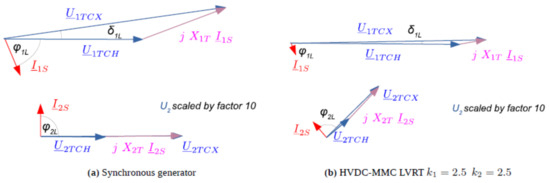 Phasor diagrams of a 4 Ω phase-to-phase fault at node N3 with Q1 synchronous generator (a) or HVDC-MMC (b) supply with reactive positive-sequence current and additional reactive negative-sequence current injection (40 ms after fault inception).