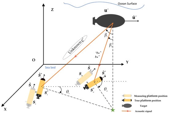 The aforementioned algorithms can attain the Cramér–Rao lower bound (CRLB) under reasonable observation error conditions [27]. However, due to the complexity of the marine environment, these localization algorithms are not directly applicable to underwater multi-platform localization scenarios. Figure 1 illustrates a real underwater multi-platform localization model. Firstly, sensors typically measure the platform’s underwater position, velocity, and other parameters, which suffer from inaccuracies and are inevitably influenced by measurement errors. We refer to these inaccuracies as the platform’s systematic errors. The neglect of such errors significantly degrades the localization performance [28]. Secondly, the propagation speed of the acoustic source signal is influenced by water temperature, water pressure, and seawater salinity [29,30], introducing uncertainty. In certain shallow water areas [31], it may even be entirely unpredictable. Therefore, in this study, we treat the sound source signal velocity as an unknown constant.