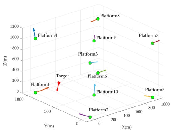 The number of mobile platforms also affects the target localization performance. Therefore, this section evaluates the performance of the proposed algorithm under different numbers of mobile platforms. The simulation conditions are the same as those set in Section 6.3, with a randomly selected localization scenario. The number of mobile platforms is set to .