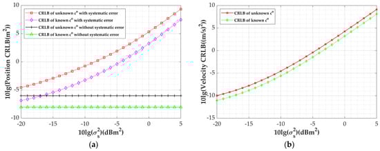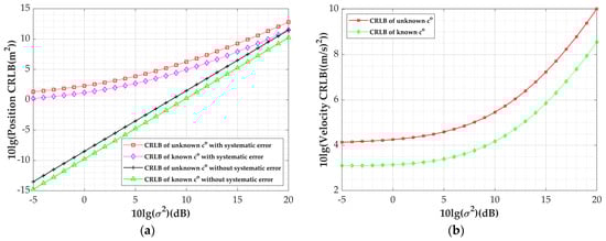 Figure 4 shows the variation in the CRLBs incorporating the systematic error of the moving platform. The measurement error variance , ; again, it can be seen that the CRLB at an unknown sound speed is higher than the CRLB with the speed of sound known. It can also be seen from Figure 4b that when the systematic error is less than −17 dB, the CRLB with systematic error and with the speed of sound known is higher than the position estimation error at an unknown sound speed and with no systematic error. This indicates that the smaller the error, the greater the effect of the speed of sound being unknown on localization.