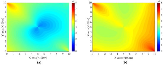 In order to better verify the localization performance of moving targets when the speed of sound is unknown/known, it is assumed that the parameters of the underwater mobile observation platform are the same as above, , , . The unknown moving target moves from a water area of from left to right at a speed of until it reaches a water area of with a localization period of 1 s. Figure 5 gives the CRLBs in the two cases with the moving targets at different positions. It can be seen that at the same position, the CRLB values in Figure 5b are generally larger than the CRLB values corresponding to Figure 5a.