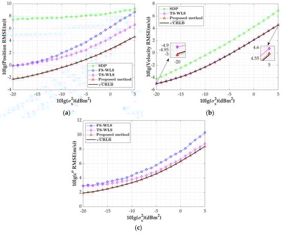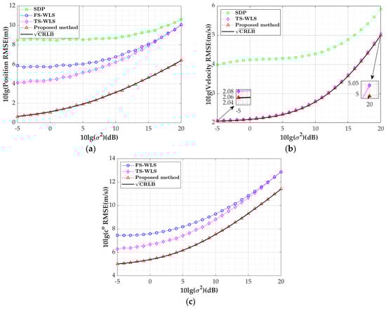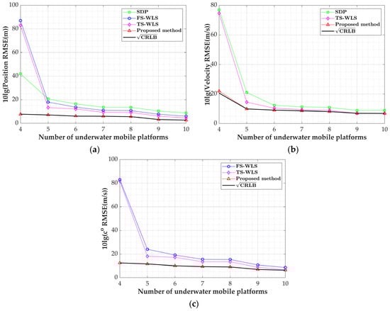 Similarly, the estimated RMSE of the proposed algorithm in this paper achieves the CRLB with variations in the systematic error and outperforms the other three algorithms. From Figure 7a, it is evident that when , the position estimation RMSE of the algorithm proposed in this paper is at least 6 dB lower than that of the SDP algorithm, which does not consider errors in the speed of sound, and at least 2 dB lower than that of the TS-WLS algorithm. Comparing Figure 7b,c, it can be seen that as the systematic error increases, the trends in the growth of the speed estimation RMSE of the SDP algorithm and the sound speed estimation RMSE of the FS-WLS algorithm are more significant than those of the other two algorithms. This is mainly due to the fact that the SDP algorithm ignores the effect of sound velocity conditions in its operation, while the FS-WLS algorithm does not fully consider systematic errors. It is also noted that the performance gap between the TS-WLS algorithm and the algorithm in this paper decreases because both algorithms ignore second-order errors. When the error increases to a certain point, this approximation method will no longer be accurate. Nevertheless, under small error conditions, the algorithm in this paper still outperforms the TS-WLS algorithm.
