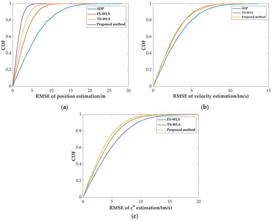 Figure 8 depicts the cumulative distribution function (CDF) plots of the RMSEs for the target source position, velocity, and sound speed estimation. Observing Figure 8a, it is evident that the abscissa corresponding to the curve of the proposed algorithm is significantly smaller than that of the other three algorithms, even at the same CDF value. This indicates that in the simulation environment in this section, the RMSE in the target position estimation of the proposed algorithm is significantly smaller than that of the other three algorithms, even at the same probability level. Similarly, the conclusions drawn from Figure 8b,c indicate that the proposed algorithm performs comparably to the TS-WLS algorithm in velocity estimation but outperforms the SDP algorithm. Additionally, in sound speed estimation, the RMSE of the proposed algorithm is superior to that of the TS-WLS and FS-WLS algorithms.