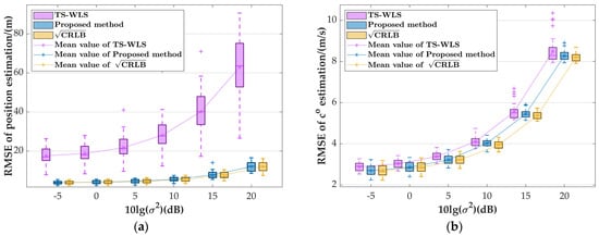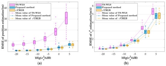 Figure 10 illustrates that the box maximum and minimum values for the estimated RMSEs and CRLBs from our algorithm are remarkably close. For instance, when , the maximum RMSE for position estimation and its corresponding CRLB are 16.4537 m and 16.0758 m, respectively, with a difference of merely 0.3779 m. Similarly, the minimum values are 8.5482 m and 7.5654 m, differing by 0.9828 m, while the average values are 12.0175 m and 12.0354 m, differing by only 0.0179 m. In contrast, for the TS-WLS algorithm, the maximum, minimum, and mean values are significantly higher, at 90.643 m, 26.5601 m, and 62.9327 m, respectively, compared to 74.18 m, 18.0119 m, and 50.9152 m for our algorithm. Furthermore, Figure 10b reveals that our algorithm’s sound speed estimation RMSE deviates by 0.0863 m/s and 1.5868 m/s from the maximum values of the corresponding CRLB and TS-WLS algorithms, respectively. It also deviates by 0.0230 m/s and 0.0206 m/s from the minimum values and by 0.0719 m/s and 0.3002 m/s from the mean values. The analysis above clearly demonstrates that within a specific range of measurement errors, for various far-field target positions, our algorithm achieves estimated RMSE values for the target position and speed of sound that closely match the corresponding CRLB and outperform the TS-WLS algorithm.