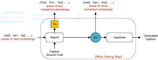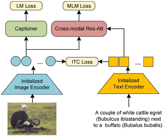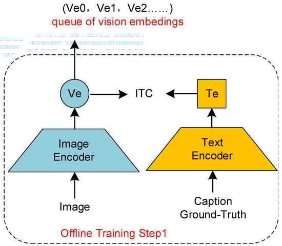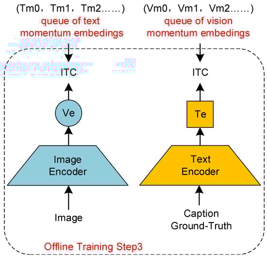 Firstly, as illustrated in Figure 4, we feed the image–text paired dataset to the unimodal encoders, obtaining image encodings through the ITC loss. Subsequently, as depicted in Figure 5, we feed to the Res-Att module. Based on the momentum encoding method proposed in Section 3.4.1, a cross-modal momentum encoding queue is obtained using the joint loss function shown in Equation (7). Specifically, we obtain a visual momentum encoding queue and a language momentum encoding queue . Then, as shown in Figure 6, we feed back the momentum encodings to update the unimodal encoders: