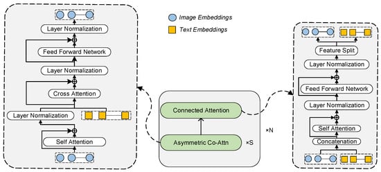 In accordance with [], we adopted the practice of concatenating every S Asymmetric Co-Attention (AC) block with a Connected Attention (CA) block, thereby creating a Cross-Modal Skip-Connection (CK) module. Furthermore, the Cross-modal Res-Att is concatenated with N CK modules. As visually represented in Figure 3, we represent the Self-Attention layer, Cross Attention layer, Feed Forward Network, Layer Normalization, and Concatenation layer as SA, CA, FFN, LN, and Cat, respectively. The image embedding is denoted as , while the text embedding is represented as , consisting of word vectors corresponding to the input caption paired with I. Here, ‘I’ signifies the input image, ‘’ refers to the i-th patch within it, and an additional [CLS] token is utilized to summarize the input sequence. Let , and represent the input word vectors, visual features, and output of the S-th AC layer, respectively. Then,