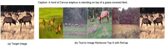 The core idea of our proposed method is briefly summarized as follows. Firstly, through the joint training of cross-modal retrieval and image-captioning tasks, we obtain a momentum-encoded queue with a contextual understanding of image–text pairs. This serves as an information bridge to train a cross-modal image encoder and a cross-modal text encoder using contrastive learning methods. This pair of encoders forms the basis for cross-modal fine-grained semantic consistency, as they determine the extraction and embedding of representations of various modal data into a shared cross-modal semantic space distribution. After training, our model yields an image encoder, a text encoder, and a captioner, which are the three key modules of ReCap. Due to the absence of a standardized task on a common dataset that can comprehensively evaluate our proposed method, we selected several standardized tasks on public datasets to individually test the performance of the three key modules of ReCap. Conducting experiments on standardized tasks on public datasets facilitates comparison with state-of-the-art (SOTA) methods on leaderboards, which, on the one hand, validates the effectiveness of the proposed method and, on the other hand, allows for a level measurement through comparison. Specifically, the experimental section validates the effectiveness of the captioner through the image-captioning task on the MSCOCO dataset as shown in Table 2. The effectiveness of the image encoder and text encoder’s cross-modal representations is verified through cross-modal retrieval tasks as shown in Table 3. The effectiveness of the image encoder is validated through the image classification task on the iNaturalist 2018 dataset as shown in Table 4. Additionally, Table 2, Table 3 and Table 4 in the experimental section reflect the proposed method’s multi-task perspective.