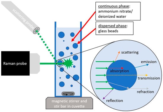 In this paper, a dispersion of glass beads of different sizes in an ammonium nitrate solution is investigated with the aid of Raman spectroscopy. The signal losses caused by the dispersion are quantified by an additional scattered light measurement and used to correct the measured ammonium nitrate concentration. Each individual glass bead represents an interface at which the excitation laser is deflected from its direction causing distortion in the received Raman signal. It is shown that the scattering losses measured with the scattered light probe correlate with the loss of the Raman signal, which means that the data obtained can be used to correct the measured values. The resulting correction function considers different particle sizes in the range of 2–99 µm as well as ammonium nitrate concentrations of 0–20 wt% and delivers an RMSEP of 1.952 wt%. This correction provides easier process access to dispersions that were previously difficult or impossible to measure.