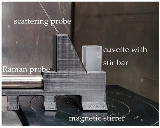 The measurement setup consists of a macro quartz glass cuvette from Hellma (Müllheim, Germany) with a sample that is placed in the focal point of two probes and positioned on a magnetic stirrer (Figure 1). An InPhotonics (Norwood, MA, USA) RPS785/16-5 probe was used to excite the sample. It has a focus length of 7.5 mm with a spot size of 158 µm and a numerical aperture of 0.27. The probe is connected to a Raman spectrometer MultiSpec Desk ETH with an LS-LD laser cassette (785 nm excitation wavelength) and an SC-CCD RAMAN spectrometer cassette (detection range 319–3213 cm−1 with increments of 1 cm−1) from tec5 (Steinbach, Germany). The laser power can be set between 50 and 500 mW and was adjusted to the maximum output for the measurements. The detector is a scientific thermoelectric-cooled CCD detector with a spectral resolution of 7 cm−1. The position of the probe was adjusted so that the focal point was approx. 2 mm inside the cuvette. Normally, measurements would be taken in the center of a cuvette, but previous studies [] have shown that a lower penetration depth is beneficial for the signal at higher particle concentrations. The second probe is a self-built scattering probe consisting of seven 200 µm fibers arranged in a circle. It has already been tested in other applications and has proven to be robust and cost-effective in the use of scattered light measurements []. This probe does not emit its own light, but it is only used to detect scattered light. For this purpose, it is connected to an MCS 601 UV-NIR C spectrometer from Zeiss (Oberkochen, Germany) (detection range of 190–1015 nm with increments of 0.5 nm) with a spectral resolution of 2.4 nm. The inner components consist of a grating with a diode array.