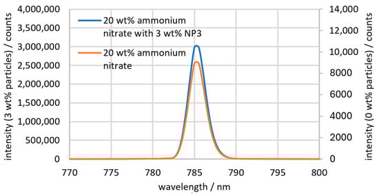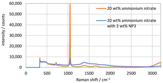 Initially, the peak of the Raman spectrum to be examined must be identified. As an example, the spectra of 20 wt% ammonium nitrate with no particles and with 3 wt% particles are shown in Figure 3. Ammonium nitrate (NH4NO3) consists of NH4+ and NO3− ions, which can be identified in the Raman spectrum by their characteristic bands. In the spectrum shown, the NO3− ions generate relatively weak signals at 716 cm−1, 1390 cm−1 and 1671 cm−1 and a strong signal at 1047 cm−1, which is most suitable for identifying the ammonium nitrate concentration. NH4+ only produces a weak signal at 1460 cm−1, which overlaps with the signal of the NO3− ions [,,]. The NO3− peak at 1047 cm−1 is therefore best suited for evaluation. This peak has a FWHM (full width half maximum) of 11 cm−1 and is detectable both with and without 3 wt% particles. All intensities of the Raman signal that were measured refer to this peak. The measurement signal of the water content cannot be evaluated in these spectra, as the significant OH peak is at approx. 3400 cm−1 and only a small part of the side at 3200 cm−1 is recognizable [,]. The glass beads themselves do not generate a signal of their own that can be measured in the spectrum.