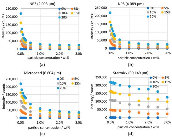 All Raman data of the ammonium nitrate peak are plotted in Figure 4 sorted by particle size over the particle concentration. Because of the previous normalization, the 0 wt% measurement points of all particle sizes and the same ammonium nitrate concentration correspond to each other. In principle, there is a linear correlation between a Raman signal and the concentration of the target. Examining the measurement points at a constant particle concentration, it can be seen that this correlation exists for the ammonium nitrate concentration. However, the observation over the particle concentration provides a steep course up to 0.25 wt% and then a flattening intensity curve. The measurement series of NP3 and NP5 run into saturation towards 3 wt% and then no longer show any significant changes with the particle concentration. The curves of Micropearl and Starmixx, on the other hand, do not yet show any saturation. As the particle size increases, the signal losses of the measurement decrease. While the peak heights for NP3 decrease by a factor of 6 to 10, the peaks for Starmixx only decrease by a factor of 1.6 to 2. The reduced light scattering with increasing particle size can be explained by the fact that, overall, larger particles have a smaller number of boundaries than small particles at the same concentration.