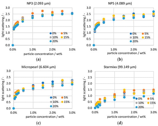 Analogous to the Raman data, the scattered light data are sorted by particle size and plotted over the particle concentration (Figure 6). The calculation according to the Beer–Lambert law, which takes the measurement points with 0 wt% particles as a reference, results in an origin in the zero points of the graphs for all measurement series. The curves are comparable to those of the Raman measurements, as here, too, the measurement signal changes very strongly up to 0.25 wt% and then becomes saturated. The correlation can also be logically explained by the fact that the more laser radiation is scattered, the lower the excitation of the sample and the intensity of the Stokes scattering. The correlation can also be seen in the fact that the light scattering decreases with increasing particle size.