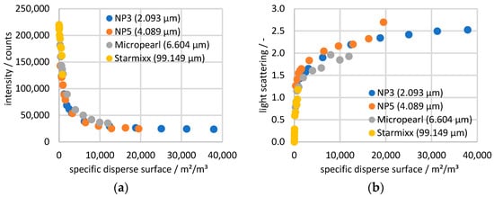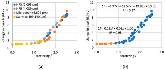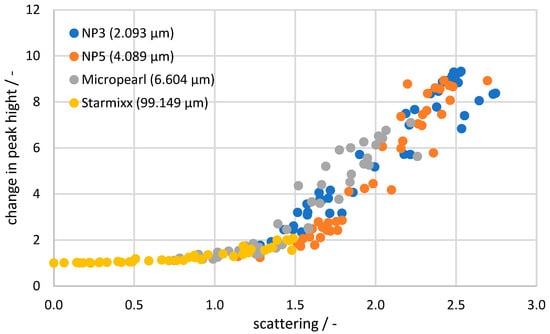To view all the measurement data in a collective context, the Raman data are plotted as a change in peak height (compared to the 0 wt% particle measurement) against the corresponding scattered light value in Figure 8. A trend comparable to the plot against the specific disperse surface can be seen, where the Starmixx data are distributed over lower x-axis values than the remaining data sets. For the NP3, NP5 and Micropearl data points, the spread across the x-axis also correlates with the particle size. The clear difference to Starmixx is due to the particle size being up to 47 times larger. Nevertheless, the overall picture shows a clear trend between the peak height change and light scattering. Especially in the range below a scattering of 1, the deviations of 0.02 from the trend are quite small. Above 1, the curve becomes more of a scatter plot and shows a deviation of 0.57 from the trend. The diagram demonstrates the direct correlation between Raman peak and scattering losses, making the measurement data independent of any knowledge of the particle size or specific dispersed surface area. All factors influencing the measurement signal are reflected in the form of the scattering loss.