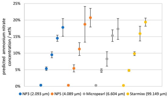 The highest deviation with an RMSEP of 5.386 wt% occurs with NP5 and 15 wt% ammonium nitrate. The region at 0.1–0.2 wt% particles is significant for this, as the deviation there ranges from 7.2 to 10.2 wt%. The Raman data and scattered light data initially show no clear anomalies. Figure 8 shows that the NP5 data tend to be lower than other data points and are therefore below the regression curve. This results in an over-correction, which can be seen in the data points in question. The reverse is true for Micropearl at 10 wt% ammonium nitrate, for example, where the data points are above the regression curve and under-correct the prediction by 3.2–4.1 wt%. The best predictions occur in the range of the 0 and 5 wt% ammonium nitrate concentrations, where the deviation is as low as 0.25 wt% for Starmixx at 0 wt% ammonium nitrate and 0.311 wt% at 5 wt% ammonium nitrate. Overall, this results in an RMSEP of 1.176–2.896 wt% for the average observation per particle size and an RMSEP of 1.952 wt% when considering all measurement data. As mentioned before, the lower concentrations have a much lower RMSEP compared with the average value and some outliers have a higher value. But considering that the signal approaches zero without the correction, an overall averaged RMSEP of 1.952 wt% of the prediction gives a good indication of the actual value of the data. While this accuracy is quite high for precise concentration determinations and compared with homogeneous mixtures, the accuracy is well suited for reaction tracking or trend measurements.