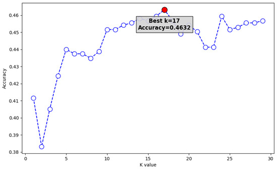 K-nearest neighbors (KNN), being a distance-based learning algorithm, requires the standardization of all training data. Figure 5 shows the graph of accuracies based on the number of K neighbors, and even at the highest K value, KNN showed objectively low performance (0.4632).