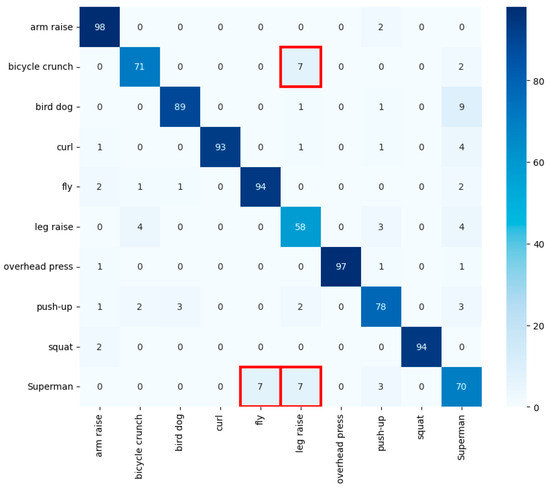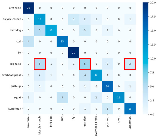 Random forest’s confusion matrix. The red box indicates frequent misclassifications of leg raises as bicycle crunches or bird dog.