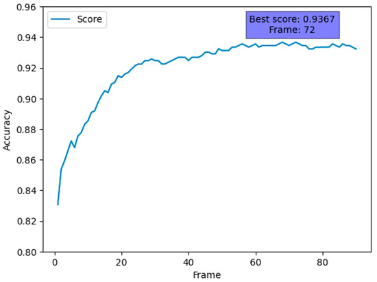 Figure 10 shows the data cross-validated using five stratified k-folds. Observing the accuracy per frame, the highest value was from about 70 frames, but, in reality, performance above 0.92 was reached after approximately 30 frames. Therefore, we decided to apply ensemble learning at 30 frames, where both quick judgment and high performance were achieved.
