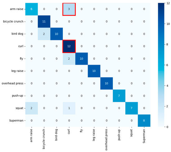 Confusion matrix from real data. red box indicates curls were classified accurately and arm raises exhibited notable misclassifications.