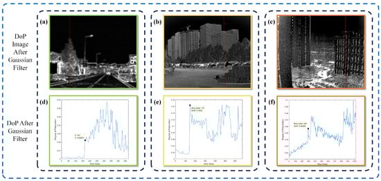 Figure 5 demonstrates the results achieved through the utilization of Gaussian filtering with parameters and on the polarization degree images depicted in Figure 2. Analysis of sections a-c reveals that the edge details within the scene are preserved post the application of Gaussian filtering to the polarization degree image. Simultaneously, the object area effectively eliminates the extremely low values. Graph the polarization degree curves for the column highlighted in red. In comparison to Figure 2g–i, the polarization degree displays a more uniform appearance, and the very low polarization values within the object area are raised, ensuring that the minimum polarization values in the image are concentrated in the sky region. Additionally, the enhancement of gradients at the boundary between the sky and the object becomes more pronounced.