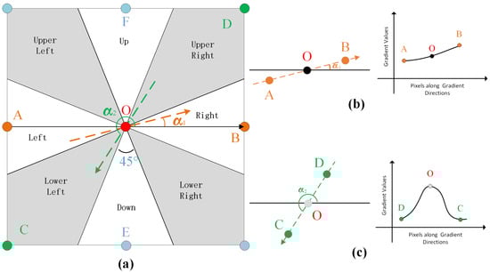 In the Gaussian filtering procedure discussed in Section 4.1, there is a possibility of amplification of edges. To address this issue, the non-maximum suppression method [28] is employed to eliminate points that do not represent edges, with the objective of maintaining the edge width as close to one pixel as possible. According to the requirement, if a pixel lies on an edge, its gradient magnitude should exceed the gradient magnitudes of its neighboring pixels in the gradient direction. Pixels failing to meet this condition are not identified as edge pixels.