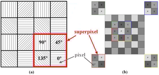 In order to apply our methodology, it is essential to obtain energy images in four distinct polarization directions, labeled as , and , for an image of a natural scene. Subsequently, the polarimetric degrees for every pixel within the acquired image are determined through the utilization of Equations (4)–(6). This computational procedure yields a visual representation known as the Degree of Polarization (DoP) map.