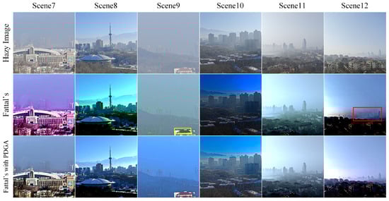 The utilization of an imprecise atmospheric light intensity vector in Fattal’s dehazing algorithm can result in significant color deviations, particularly evident in scenes 7, 8, and 9 as illustrated in Figure 14. In Scene 7, although Fattal’s dehazing algorithm shows efficacy, the heightened green component within the atmospheric light vector leads to a noticeable color shift towards purple in the resultant dehazed image. Scene 8 exhibits a predominant shift towards green in the color balance of the dehazed image due to the low green component in the atmospheric light vector. In Scene 9, the red component in the roof region, outlined by the yellow rectangular box, is notably attenuated, a consequence of the disproportionately high red component in the atmospheric light vector. Examination of the red rectangular region in Scene 12 reveals color banding when applying Fattal’s technique, a phenomenon resulting from inaccuracies in the atmospheric light vector values. This issue arises from the excessive adjustment of all three components of the atmospheric light vector, leading to a general reduction in image luminance and subsequent color banding in regions with low frequencies.