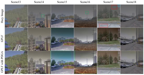 Figure 15 demonstrates the outcomes of dehazing both before and after integrating PDGA estimation to substitute the traditional global atmospheric light estimation in GPLF. The low-frequency signal characteristics in polarized images extend beyond the sky portion to specific areas of the object within the image. Consequently, certain object energies become integrated as elements of the overall atmospheric light even post low-pass filtering. Upon analysis of Scene 17 depicted in Figure 15, it is evident that the sky region is relatively limited and confined to the blue rectangular section in the upper right corner. Nevertheless, the red rectangular area also encompasses low-frequency signals. These signals are retained by the GPLF within the calculated global atmospheric light domain, potentially introducing notable estimation biases and leading to suboptimal dehazing outcomes.
