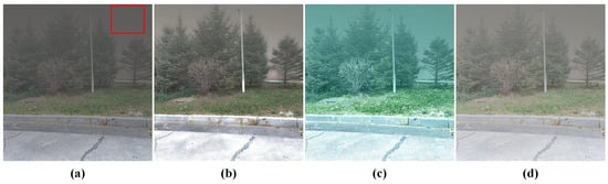 The impact of haze removal on the image of Scene 17 is demonstrated in Figure 18 after the sky region has been eliminated. Due to the lack of sky region in the image, the PDGA identifies the red rectangular area as the PZCI and estimates it as the atmospheric light intensity. However, this region encompasses energy emitted by objects beyond atmospheric light, resulting in the suboptimal performance of PDGA in the aforementioned algorithm.