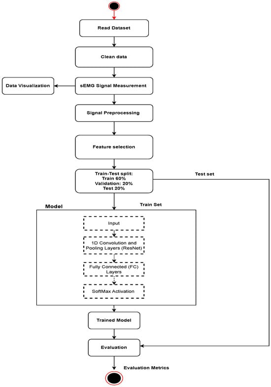 In this research, we investigated the feasibility of using electromyogram (sEMG) readings and advanced machine learning techniques for personal identification within an electronic health record (EHR) access control mechanism. The entire process was implemented using the Python programming language, leveraging popular frameworks such as TensorFlow and Keras. Our methodology, depicted in Figure 2, consisted of key stages. Firstly, we performed data preparation by acquiring an sEMG dataset comprising 20 subjects performing 12 different gestures, categorized into static and dynamic gestures. Subsequently, we applied various data preprocessing techniques, including noise reduction, normalization, and dimensionality reduction, to optimize the sEMG data for predictive modeling. Next, we divided the dataset into training, validation, and testing sets with a ratio of 60:20:20 to ensure an unbiased evaluation of the model’s generalization on unseen data. For personal identification, we employed the ResNet1D model, a deep learning architecture well suited for sequential data like sEMG signals. The ResNet1D model was trained on the preprocessed data, and its performance was assessed using standard evaluation metrics. This research aims to contribute insights into the potential of sEMG-based identification for enhancing EHR access control mechanisms.