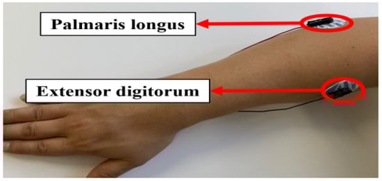 The constructed database (DB), sEMG, was obtained in multiple sessions from 200 subjects at intervals of a day or longer. The sEMG data were collected using the BIOPAC MP160CE system with the Acknowledge 5.0.2 processing software from the right arm of 200 subjects (98 males and 102 females), whose average age was 24.69 years (ranging from 19 to 70 years). The data were acquired in two channels by attaching Ag/AgCl sensors to the palmaris longus and extensor digitorum muscles of each subject, as illustrated in Figure 3. The sensor was placed precisely at points where significant muscle changes occur during hand gestures. A demographic survey was conducted with the participants before the signal recording process.