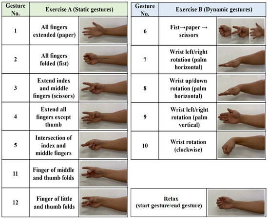 The collected sEMG dataset consisted of 20 subjects, each performing 12 different gestures, as depicted in Figure 6. These gestures encompassed both static and dynamic movements of the hand, reflecting commonly used actions in everyday life. The static gestures involved single movements, while the dynamic ones involved continuous movements. To ensure accurate and comprehensive data, the sEMG signals were recorded over three sessions, with a day or longer intervals between each session. This multi-session approach captured the variability in the sEMG signals over time. For each subject, data for each gesture were obtained in three sessions, resulting in a total of 30 sEMG signals (10 repetitions × 3 sessions) per gesture. Consequently, each subject contributed 360 sEMG signals (12 gestures × 10 repetitions × 3 sessions) in total.